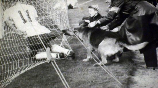 Fortunas Linksaußen Dieter Wöske rutschte bei einer Aktion ins Netz des Kölner Tores, da schnappte Polizeihund "Ajax" beherzt zu - Wöske konnte unverletzt weiterspielen, aber eine 3:4-Niederlage seiner Mannschaft auch nicht verhindern.