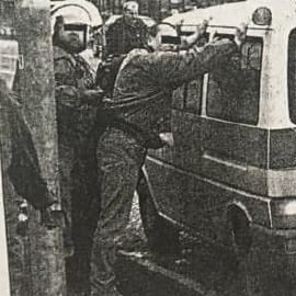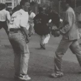 Fortunas Linksaußen Dieter Wöske rutschte bei einer Aktion ins Netz des Kölner Tores, da schnappte Polizeihund "Ajax" beherzt zu - Wöske konnte unverletzt weiterspielen, aber eine 3:4-Niederlage seiner Mannschaft auch nicht verhindern.