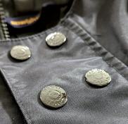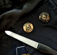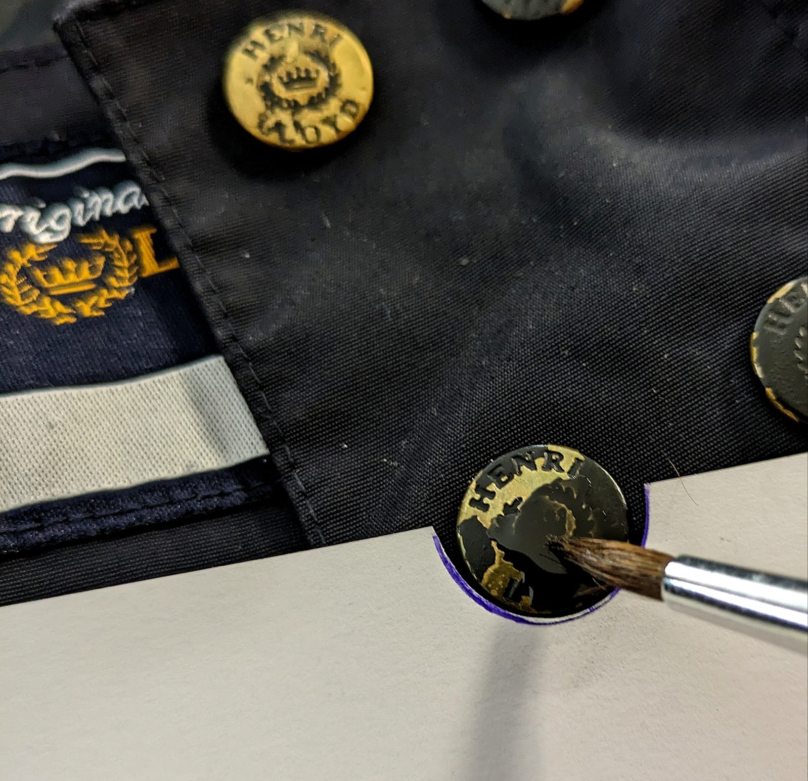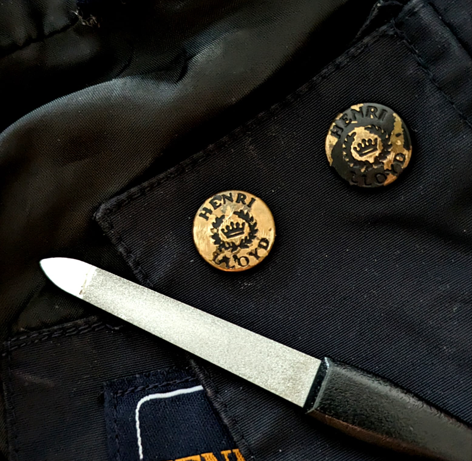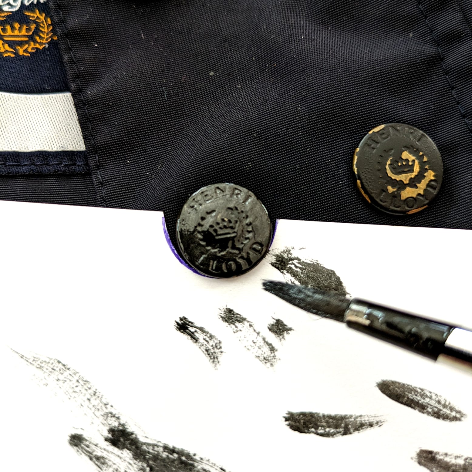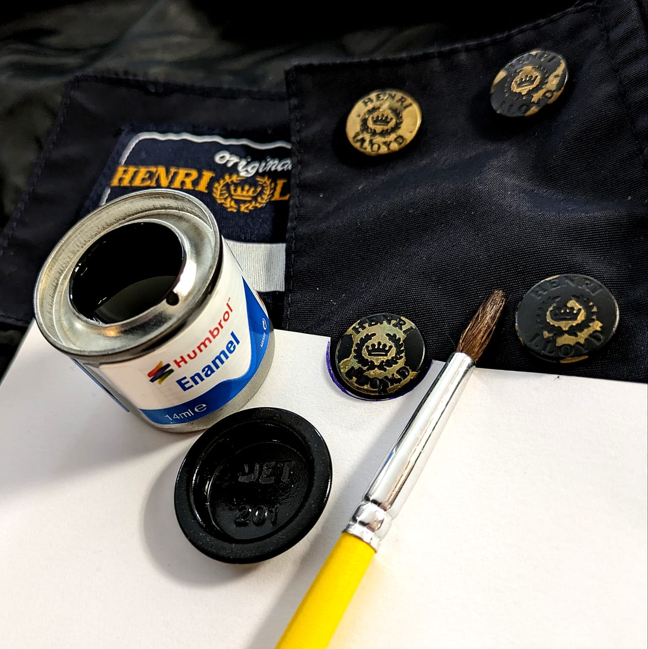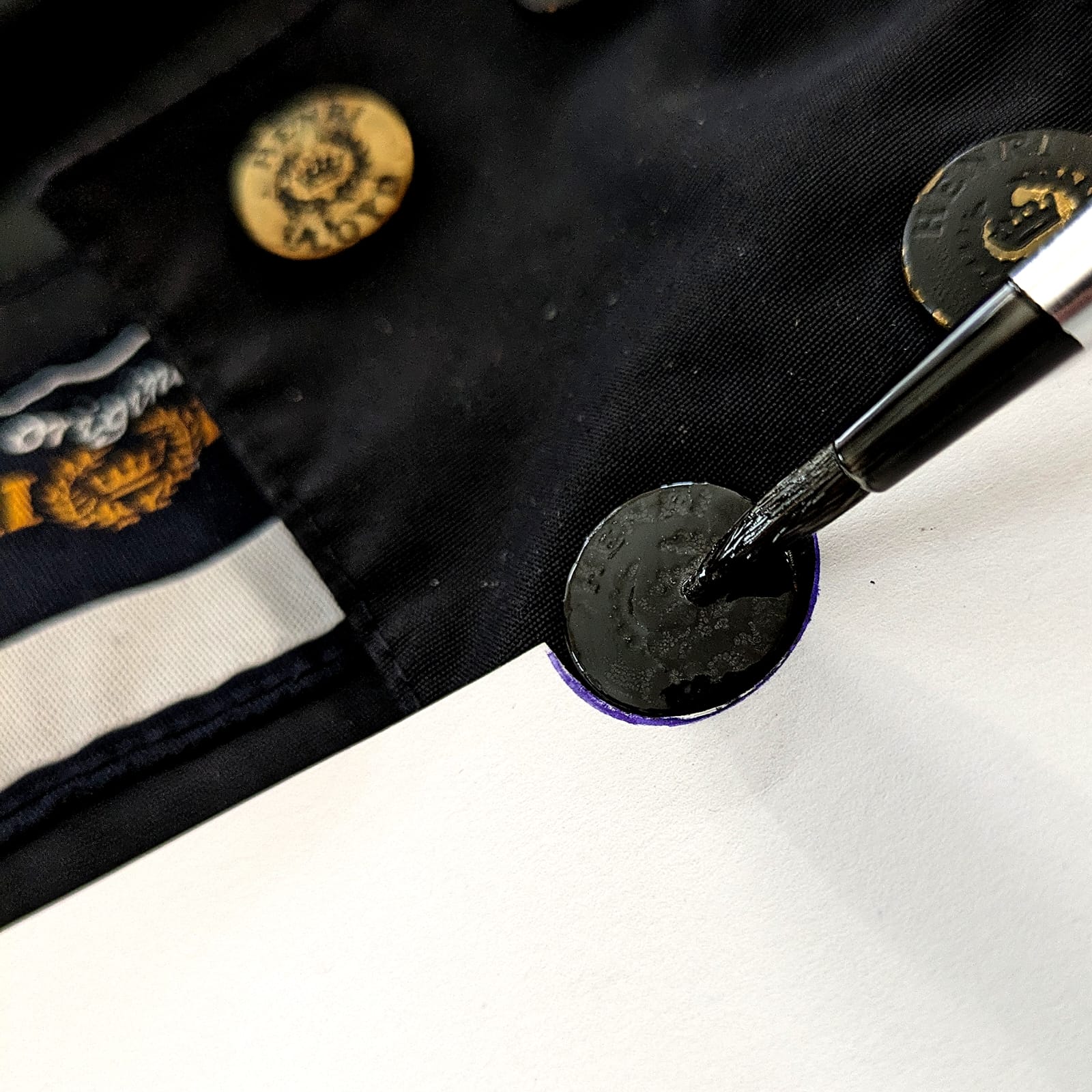 - Knöpfe sorgfältig reinigen/entfetten (oder wie in diesem Fall das Kleidungsstück vorher in die Reinigung bringen)