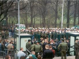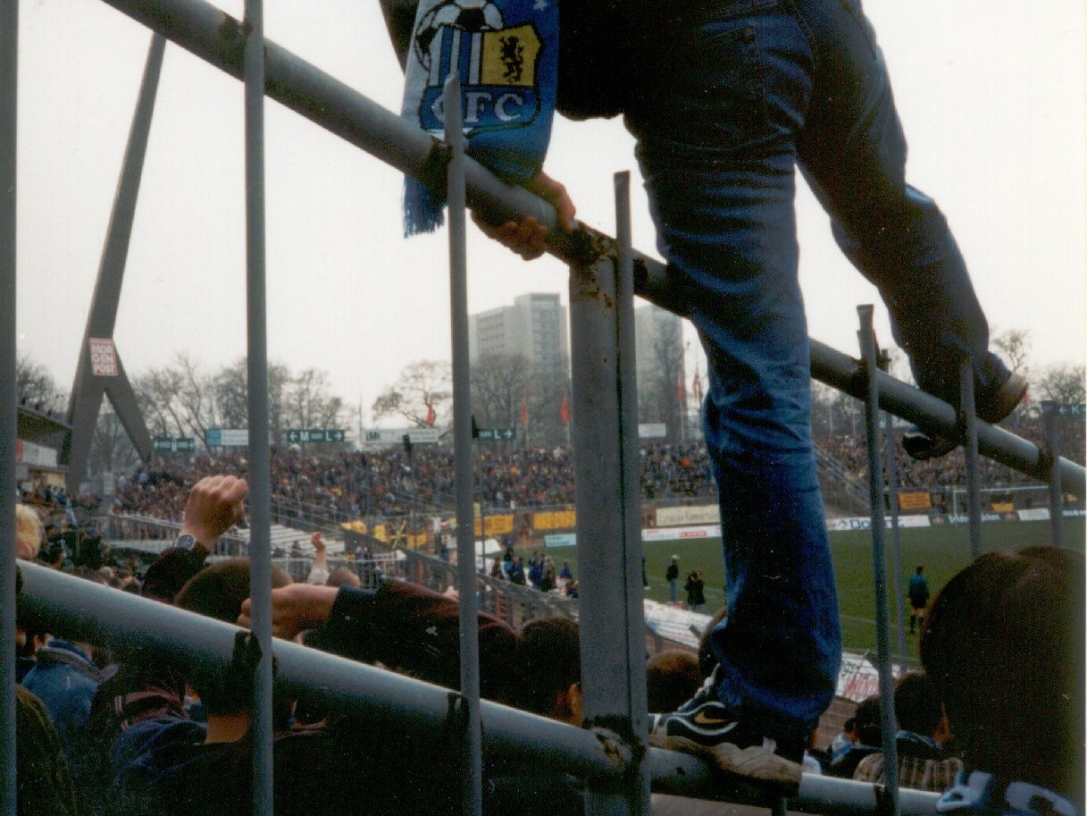 Auf dem anschließenden Weg zum RHS säumten zwar einige Bullen die Flanken des Mobs, aber eher schlecht als recht. So wurden eben die ersten Trophäen von den umliegenden Dynamo-Fans einkassiert. Gerd war schwer begeistert, konnte aber seinen ersten Schal erst im Jahre 2001 organisieren. Egal, heute hieß es zuschauen und lernen!