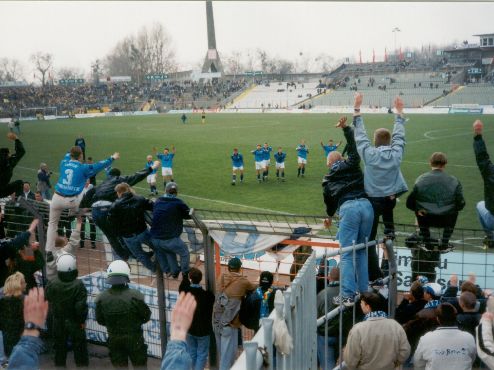 Naja, rein in den Zug, Abteil gesichert, Schiebetür geschlossen, aus der Jacke raus und Vorhang zugezogen….durchatmen. Dem flauen Gefühl folgte schnell wieder die Freude auf den Ausflug in die Landeshauptstadt. Man war das geil, das erste Mal mit seinen Kumpels zum Fußball und das auch noch zu einem richtigen Kracher. Sachsenpokalhalbfinale gegen Dynamo Dresden, die damals noch das Kürzel 1.FC im Namen trugen. Schnell das Schiebefenster runter und den frisch geschorenen Schädel zum Fenster raus gehalten, kurzer Blick zurück zum Hauptbahnhof und die Hülsen geöffnet. Prost Jungs…das wird ein guter Tag!