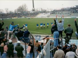 Am Stadion Karte geholt und rein ins Rund. Dem langen Warten bis zum Anpfiff folgte ein Sirenengeheul in der Ferne. Nach und nach versammelten sich immer mehr Leute am oberen Ende des Gästeblockes, von wo aus man zur damaligen Zeit echt prima auf die Lennestraße schauen konnte. Immer mehr Leute tuschelten „…die Hools kommen…“. Kurze Zeit später bekam man sie zu Gesicht. Umringt von der Staatsmacht tauchten sie am Gästeeingang auf und schmetterten einen brachialen Schlachtgesang Richtung Auswärtsfans, welcher umgehend mit Applaus aus dem Block bedacht wurde. Viele der Hauer hatten dunkelblaue Bomberjacken an und sahen aus wie eine kleine Armee. Bezahlen wollten nur die Wenigsten und der Ordnungsdienst machte auch rasch den Weg frei.